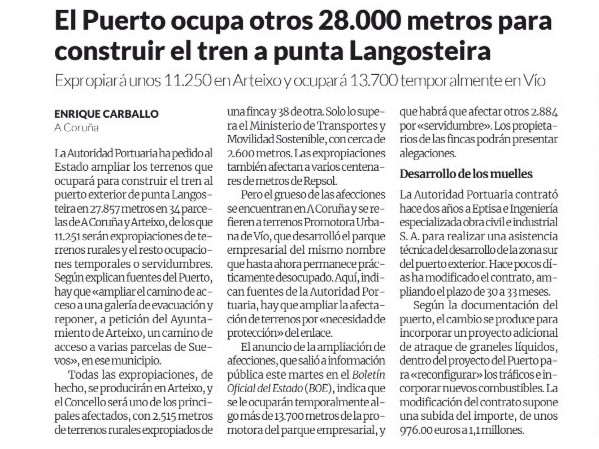 La Opinión 10/09/25.- La Autoridad Portuaria ha pedido al Estado ampliar los terrenos que ocupará para construir el tren al puerto exterior de punta Langosteira en 27.857 metros en 34 parcelas de A Coruña y Arteixo, de los que 11.251 serán expropiaciones de terrenos rurales y el resto ocupaciones temporales o servidumbres. Según explican fuentes del Puerto, hay que «ampliar el camino de acceso a una galería de evacuación y reponer, a petición del Ayuntamiento de Arteixo, un camino de acceso a varias parcelas de Suevos», en ese municipio.