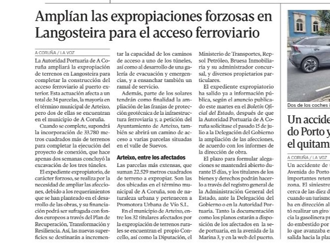 La Voz de Galicia 10/09/25. - La Autoridad Portuaria de A Coruña ampliará la expropiación de terrenos en Langosteira para completar la construcción del acceso ferroviario al puerto exterior. Esta actuación afecta a un total de 34 parcelas, la mayoría en el término municipal de Arteixo, pero dos de ellas se encuentran en el municipio de A Coruña. Cuando se complete, supondrá la incorporación de 33.780 metros cuadrados más de terrenos para completar la ejecución del proyecto de conexión, que hace apenas dos semanas concluyó la excavación de los tres túneles.