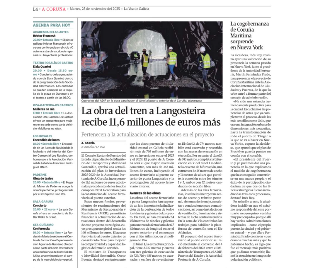 La Voz de Galicia 25/11/25 .- El Consejo Rector de Puertos del Estado, dependiente del Ministerio de Transportes y Movilidad Sostenible, ha aprobado una actualización del plan de inversiones 2025-2029 de la Autoridad Portuaria de A Coruña, incorporando 11,6 millones de euros adicionales procedentes de los fondos europeos Next Generation para la construcción del acceso ferroviario al puerto exterior en Punta Langosteira.